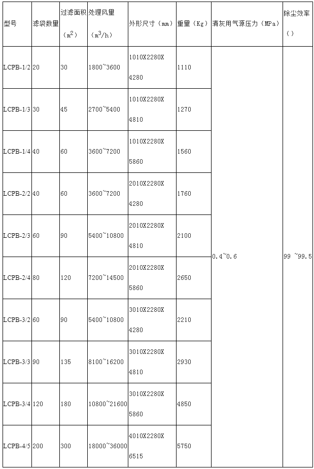 旁插扁袋脈沖除塵器規(guī)格參數(shù)表: