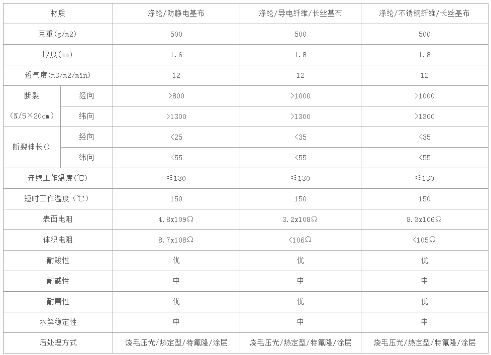 生產(chǎn)抗靜電濾布除了具有生產(chǎn)普針刺氈的工藝外,還要求在生產(chǎn)針刺氈的化學(xué)纖維中混入導(dǎo)電纖維或不銹鋼導(dǎo)電材料,制成了抗靜電性能更加優(yōu)異的抗靜電針刺氈。